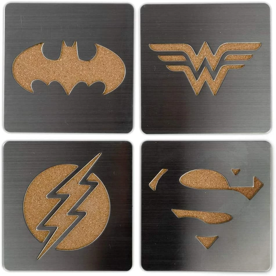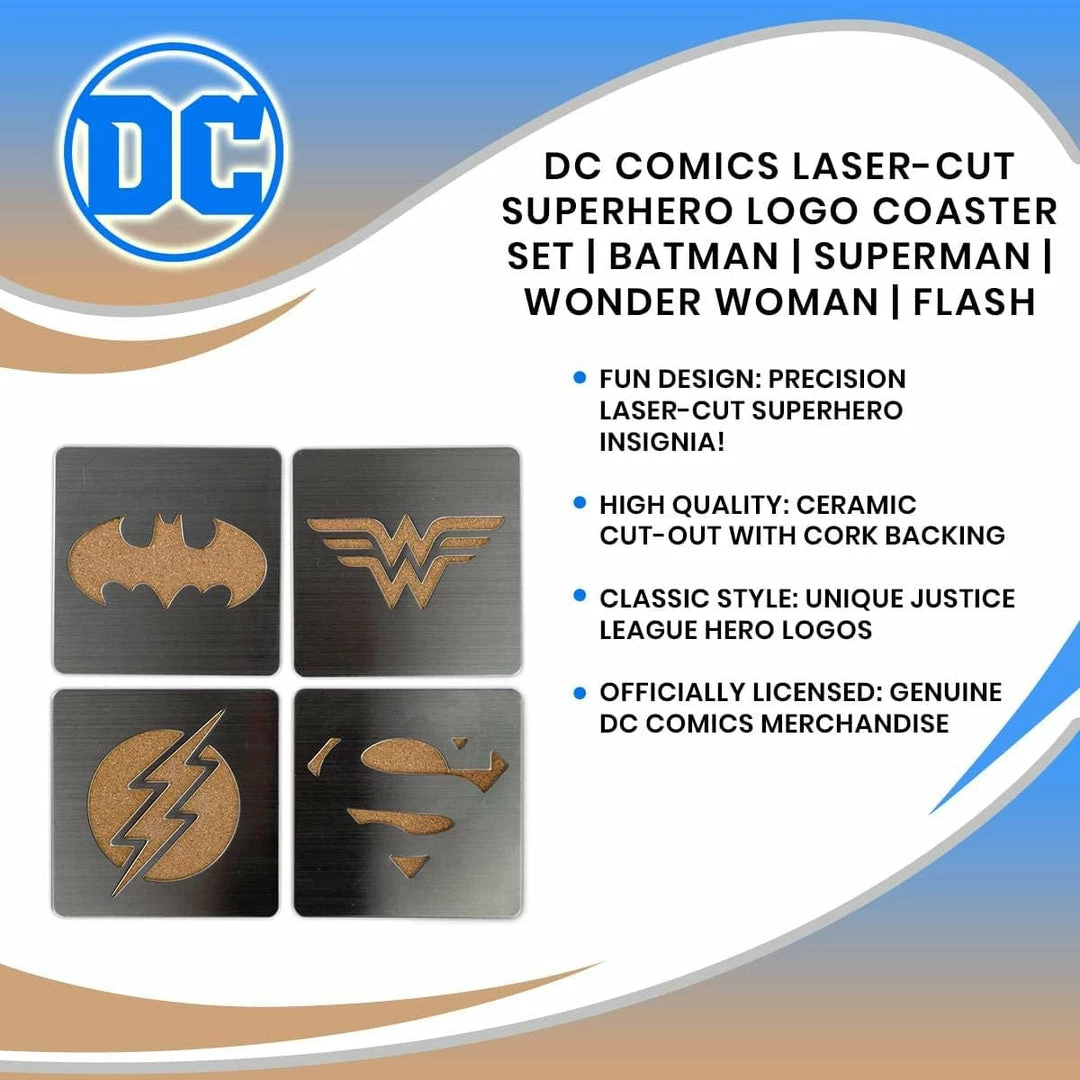 ShopHippo New DC Comics Superhero Logo 4-Piece Coaster Set | Batman, Superman, Wonder Woman & The Flash Laser-Cut Justice League Logos – Sturdy, Unique Cork & Ceramic Design – Great Gift Idea